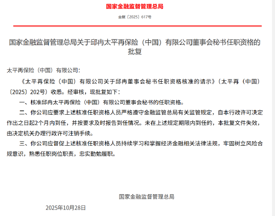 11月24日金融一线消息,国家金融监督管理总局发布批复,核准邱冉太平再保险(中国)有限公司董事会秘书的任职资格。